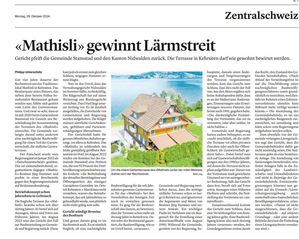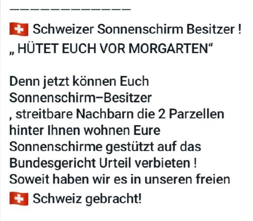 Diesem Mehrfachkläger der seine gesamte Liegenschaft vor seinem Haus zum See mit Sträuchern und Holzwänden verbarrikadiert, gab das Gericht recht und verbietet den 2 Parzellen entfernten Seeanstössern ( Besitzer& Mietern!) das aufstellen von beweglichen, verstellbaren Sonnenschirmen! Der verlorene Prozess kostete den Beklagten Fr.48‘000.- seine Anwältin hiess: Sarah Jud Anwaltskanzlei ENGELBERGER Stansstad/Luzern