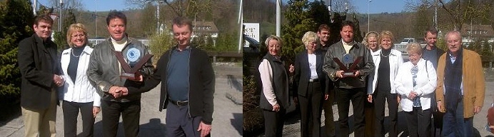 Beni Dobmann, Vorstandsmitglied von Coiffure Suisse und Vice-Präsident der kantonalen Lehrlingsprüfungskommission Kanton Graubünden und Beat Koller, eidg. dipl. Coiffeurmeister und Obmann der Prüfungskommission der Vereinigung Schweizerischer Coiffeurschulen gratulieren mit einigen Vorstandsmitgliedern Hugo und Rita Rütimann und überreichen ihnen den höchsten Preis, der die Vereinigung Schweizerischer Coiffeurschulen in den vergangenen 33 Jahren je vergeben hat, wie der Präsident Beni Dobmann anlässlich der Laudatio ausführte.