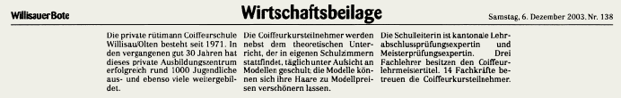 Über zwanzig Geschäftsinhaber unserer Region haben ihre theoretische und praktische Coiffeurausbildung bei uns gemacht und führen heute erfolgreiche Coiffeurgeschäfte. Einige dieser Inhaber machten später die Meisterprüfung und bilden heute selber Coiffeusen/eure aus. Aber auch Weltfirmen, wie z.B. Goldwell, haben Demonstrateure, die sich bei uns ausbilden liessen.