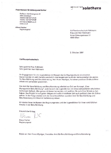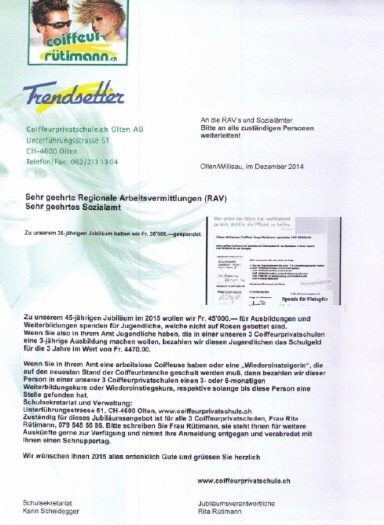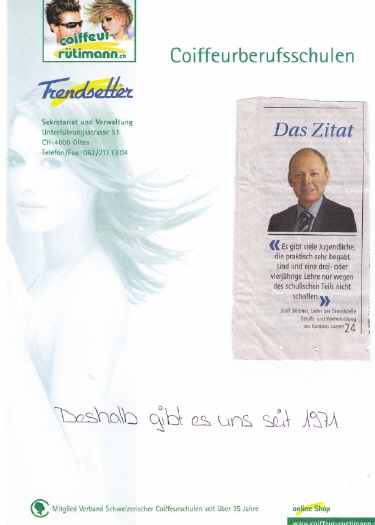 Die vor über 40ig Jahren von Hugo Jvo Rütimann, im beisein von Nationalratspräsident Dr. Franz Josef Kurmann, Willisau und Professor Paul Müller, Willisau zusammen mit dem singenden Kaplan Flury, Wangen, gegründete private Coiffeurberufsschule hat in eigenen Schulräumen schon über 1500 Jugendliche ausgebildet und über 2500 Berufsleute weitergebildet.