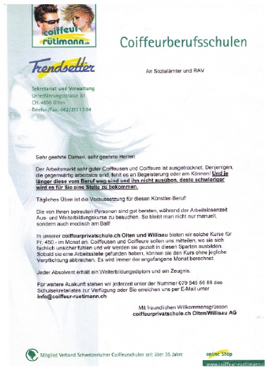Im weiteren bietet die Coiffeurprivatschule.ch AG Kurse an für WIEDEREINSTEIGERINNEN , das heisst für Leute, die den Coiffeurberuf einige Jahre, z.B. wegen Heirat, nicht ausgeübt haben.